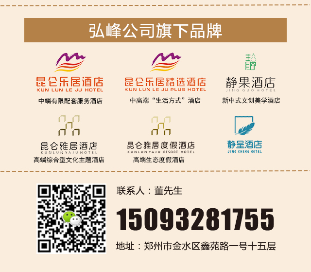 弘峰酒店管理有限公司是一家集团化酒店投资与管理公司,是河南省住宿行业的领军性企业。旗下各品牌酒店总数逾30家;现拥有“昆仑乐居酒店”(中档酒店)、“昆仑乐居精选酒店”(精品酒店)、“昆仑雅居酒店”(全配套文化设计酒店)、“昆仑雅居度假酒店”(高端度假)、“静果酒店”(都市文创酒店)等多个优质品牌。涵盖星级酒店、度假酒店、精品酒店、人力资源、商贸采购、装饰设计等,弘峰公司旗下子公司有恒捷人力资源服务公司、观璞装饰工程设计公司。